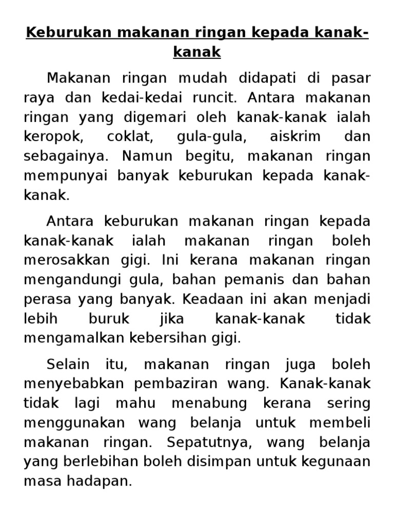 Makanan segera mudah membawa mudarat kerana tidak mempunyai nutrisi yang diperlukan untuk tumbesaran anak-anak. Contoh Karangan Pt3keburukan Makanan Segera. Penutup karangan Keburukan Makanan Ringan.